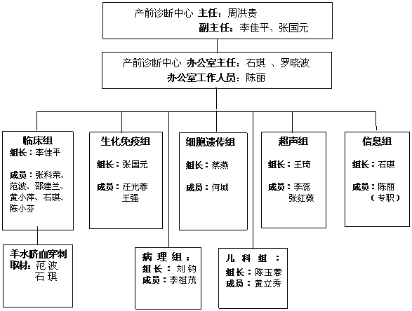 产前筛查及产前诊断工作由产科、超声科、检验科生化免疫室、医学遗传实验室、儿科及病理科等科室共同完成。成立“产前诊断中心”统一协调管理各科与产前诊断及产前筛查业务相关的工作,各科在各自工作范围内开展产前诊断及产前筛查活动,相互沟通,相互协作,共同完成产前筛查及产前诊断工作。”产前诊断中心”设主任一名,副主任若干名。主任负责管理工作,副主任协助主任工作,产前诊断中心办公室负责产前诊断中心日常事务及工作,设立主任一名,统一管理并协调“产前诊断中心”各部门的工作。